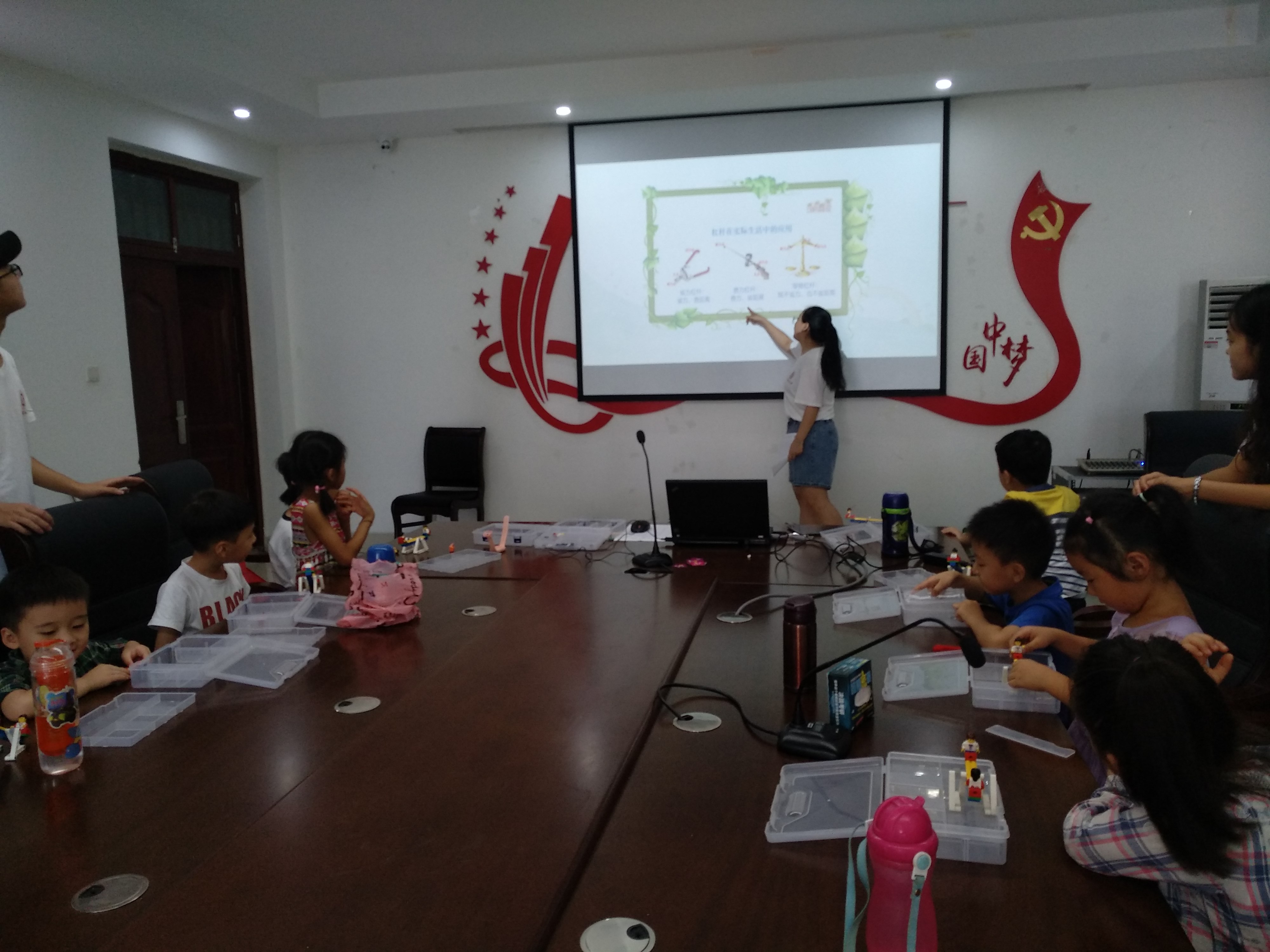 在开展创客课堂之前,队员们制作了课堂PPT,编写了课堂讲义,准备了乐高积木,做了充足的准备。本次课堂的学习主题是“杠杆原理”,通过讲解乐高积木的零部件以及展示组装完成的“跷跷板”来指导同学们自己动手组装。由组装完成跷跷板引出杠杆原理,带领同学们认识和分辨省力杠杆、费力杠杆、等臂杠杆三种杠杆。在课程的最后,在PPT上展示“天平”图片,并由同学们发挥自己的想象力和创造力组装而成。队员们耐心地指导同学们,为同学们答疑解惑,帮助同学们组装乐高积木并认识三种杠杆,了解其原理。